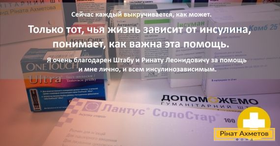 Із квітня Гуманітарний штаб Ріната Ахметова безкоштовно забезпечить препаратом інсуліну всіх неповнолітніх дітей у зоні АТО, які страждають на інсулінозалежний цукровий діабет, які звернулися на Гарячу лінію штабу. Препарат видаватимуть запасом на 3–4 місяці підтримувального лікування в межах проекту Штабу «Доступність інсуліну дітям зони АТО».