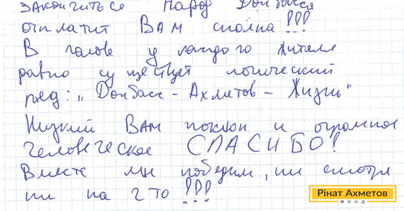На адресу Ріната Ахметова й Гуманітарного штабу надійшов лист від жителя Пролетарського району Донецька. «Спасибі Вам величезне від усіх жителів Донбасу!!! За Ваші благодіяння, доброту й чуйність! У цей нелегкий час Ви допомагаєте нам вижити. І не кидаєте нас, незважаючи ні на що», – йдеться в листі.