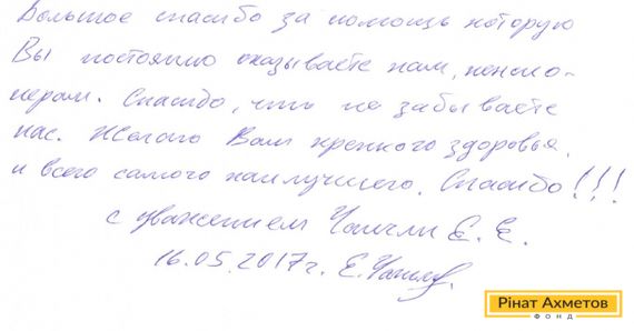 «Шановний Рінате Леонідовичу! Велике спасибі за допомогу, яку Ви постійно надаєте нам, пенсіонерам. Спасибі, що не забуваєте нас. Бажаю Вам міцного здоров’я та всього найкращого. Дякуємо!»