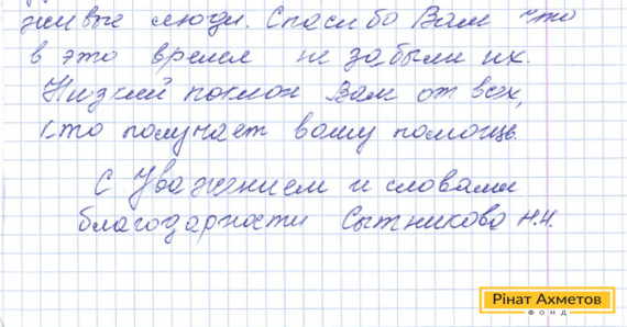 На адресу Ріната Ахметова прийшов лист від жительки Шахтарська. Наталія Миколаївна пише: «Хочу висловити вам подяку від своїх старих батьків і їхніх сусідів. Спасибі Вам, що не залишили старих у біді».