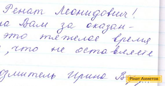 «Шановний Рінате Леонідовичу! Я дуже вдячна Вам за надану допомогу. Величезне спасибі, що в цей важкий час не залишили нас у біді», – пише місцева мешканка.