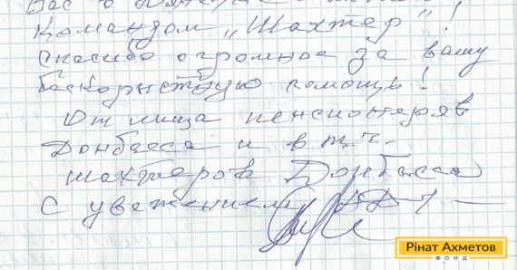 На адресу Ріната Ахметова прийшла подяка від жителя Ленінського району Донецька. «Чекаємо на Вас у Донецьку з улюбленою командою «Шахтар»! Спасибі величезне за Вашу безкорисливу допомогу від імені пенсіонерів Донбасу, зокрема від шахтарів Донбасу», – йдеться в листі.