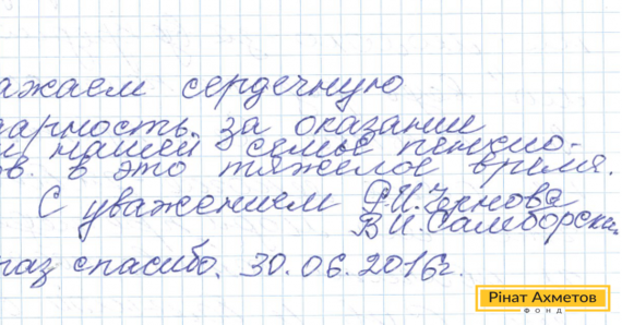 На адресу Гуманітарного штабу Ріната Ахметова прийшов лист від сім’ї пенсіонерів, яка проживає в Центрально-Міському районі Макіївки. Вони дякують Штабу за допомогу в скрутний час.