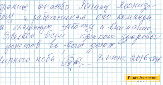 На адресу Гуманітарного штабу надійшов лист від жителя Петровського району Донецька. «Величезне спасибі Рінату Леонідовичу і працівникам його команди за надану турботу й увагу. Бажаємо всім міцного здоров’я й успіхів у справах», – йдеться в листі.