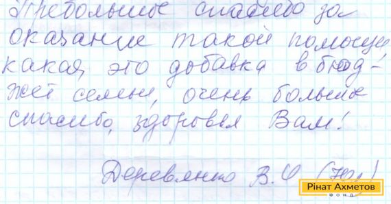 На адресу Гуманітарного штабу Ріната Ахметова часто приходять подяки від жителів з Донбасу. Люди часто передають листи мобільним волонтерам, що привозять допомогу людям, які проживають в «сірій зоні».