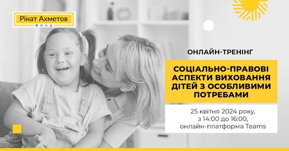 Програма «Рінат Ахметов ‒ Дітям. Сирітству ‒ ні!» повідомляє про початок реєстрації на новий онлайн-тренінг на тему «Соціально-правові аспекти виховання дітей з особливими потребами», який відбудеться наприкінці квітня.
