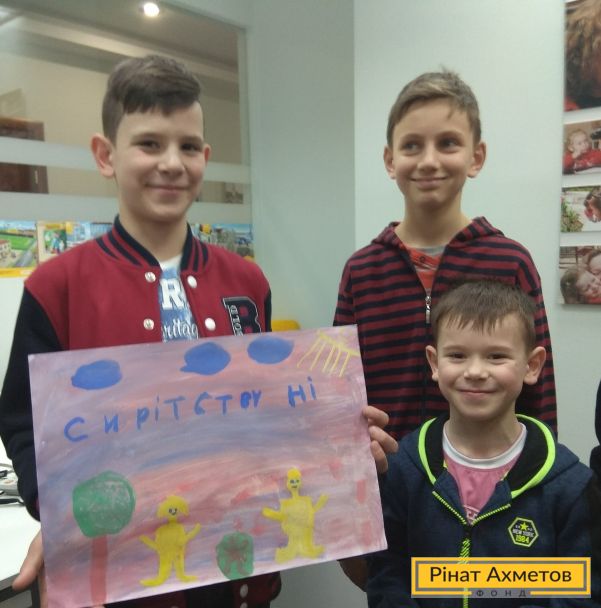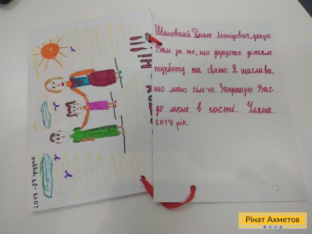 Тато Андрій швидко організував трьох синів, і всі картини через кілька хвилин вже милувалися на стінах. А єдина дочка в сім'ї Уляна попросила передати свій подарунок – барвисту листівку – Рінату Ахметову. Текст привітання одразу ж був урочисто зачитаний автором: «Шановний Рінате Леонідовичу! Спасибі Вам, що даруєте дітям турботу й свято! Я щаслива, що у мене є сім'я! Запрошую Вас до себе в гості. Уляна».