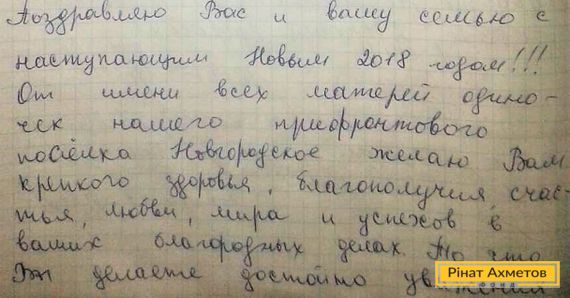 На адресу Гуманітарного штабу надійшов лист від матерів-одиначок селища Новгородське. Вони пишуть: «Шановний Рінате Леонідовичу! Вітаю Вас і Вашу родину з Новим 2018 роком... Те, що Ви робите, гідне поваги».