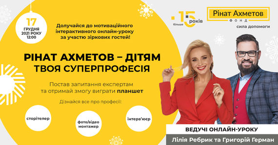 Фонд Ріната Ахметова 17 грудня проведе всеукраїнський мотиваційний інтерактивний онлайн-урок «Твоя суперпрофесія» для школярів 8-11 класів. Він є частиною масштабної Акції «Рінат Ахметов – Дітям». Цього року на його учасників чекають одразу кілька новинок. Так, для них будуть презентовані нові професії, у тому числі сторітелер, ведучий/інтерв'юєр та фото/відео монтажер.