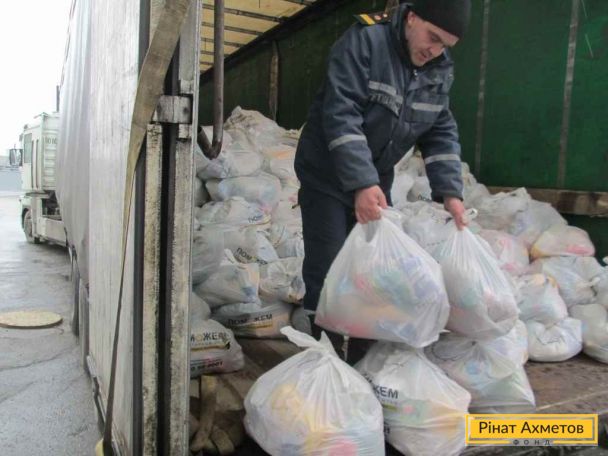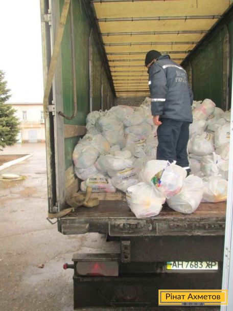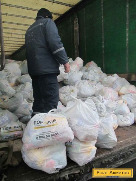 У Сватове Луганської області Штаб Ахметова доставив продуктові набори з 16-го Гуманітарного рейсу. ФОТО доставляння й розвантаження