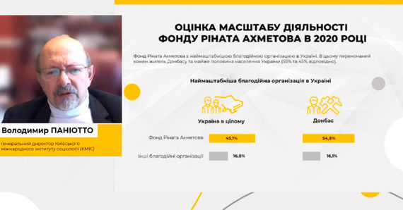 Окрім того, Фонд Ріната Ахметова визнаний найбільшою приватною благодійною організацією України. Про це сказали переважна більшість мешканців Донецької та Луганської областей (91%) і більше половини українців (55%).