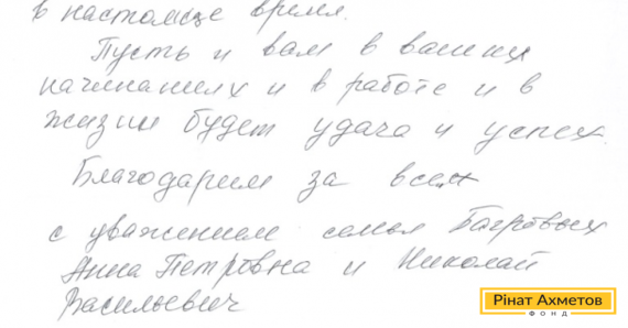 На адресу Ріната Ахметова й Гуманітарного штабу прийшла подяка від сім’ї Багрових, які отримують продуктові набори. «У такий важкий час ви надаєте підтримку пенсіонерам. Ваша допомога дає надію на майбутнє», – пишуть Анна Петрівна й Микола Васильович.