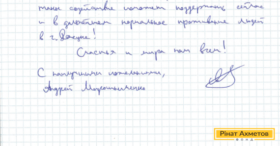 На адресу Гуманітарного штабу Ріната Ахметова прийшов лист від пенсіонера, який проживає в Київському районі Донецька. «Від імені своєї родини висловлюю глибоку вдячність за гуманітарну допомогу, яку вони надають регіональним штабом. Щиро сподіваюся, що таке сприяння допоможе підтримати зараз і надалі нормальне проживання людей у Донецьку», – мовиться в листі.