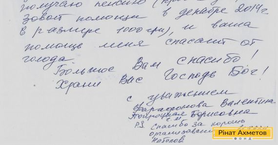 «Висловлюю величезну щиру подяку Штабу «Допоможемо» й особисто Р. Л. Ахметову за вашу величезну турботу й допомогу нам, пенсіонерам. Ваші продуктові набори допомагають нам у цей важкий час. Особисто я вже вісім місяців не отримую пенсію (…), і ваша допомога мене рятує від голоду», — мовиться в листі.