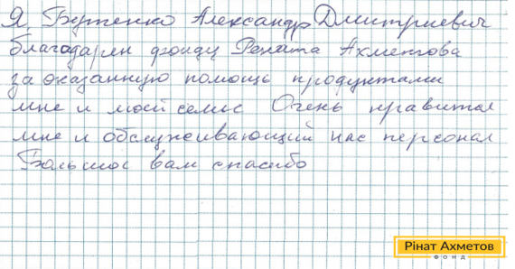 На адресу Гуманітарного штабу Ріната Ахметова прийшов лист від жителя Макіївки. Олександр Дмитрович пише: «… вдячний Штабу Рінат Ахметова за надану допомогу продуктами мені й моїй родині. Дуже подобається мені також персонал, який нас обслуговує».