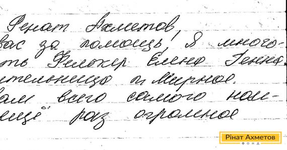 «Шановний Рінате Ахметов, дякую вам за допомогу!» – пише Олена. За словами жінки, вона – багатодітна мати, яка проживає в селищі Мирне. Вона отримує допомогу Гуманітарного штабу Ріната Ахметова й дякує за надану підтримку. «Бажаю вам усього найкращого. Величезне спасибі!», – наголосила жінка.