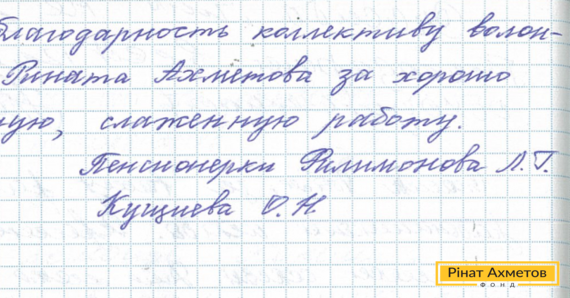 На адресу Гуманітарного штабу Ріната Ахметова прийшов лист від пенсіонерок, які отримують гуманітарну допомогу в Амвросіївці Донецької області. «Висловлюємо подяку колективу волонтерів Штабу Ахметова за добре організовану, злагоджену роботу», – пишуть вони в листі.