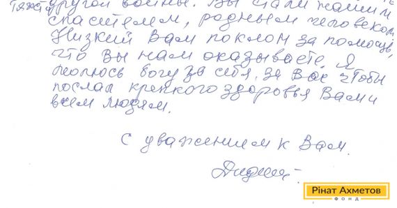 На адресу Гуманітарного штабу Ріната Ахметова прийшов лист від жительки Київського району Донецька. Варвара Іванівна пише: «Велике спасибі Вам за допомогу, що Ви нас підтримуєте з перших днів жорстокої війни. Я народилася в ту вітчизняну війну, перенесла голод, холод, всі негаразди, батька так і не знала – загинув на війні в 1942 році. І зараз на старості років доводиться терпіти злигодні іншої війни».