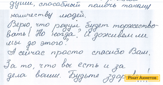 На адресу Ріната Ахметова прийшов лист від 82-річної мешканки Шахтарська. Вона пише: «Я пережила в дитинстві страшну війну, і, бачить Бог, багато віддала б, щоб зараз був мир. Ніколи не думала, що знову доведеться чути і бачити смерть, боятися за життя своїх дітей, онуків, правнуків. Величезне Вам спасибі, що не відвернулися від своїх земляків. Спасибі, що не даєте нам померти від голоду, від болю душевного і фізичного».