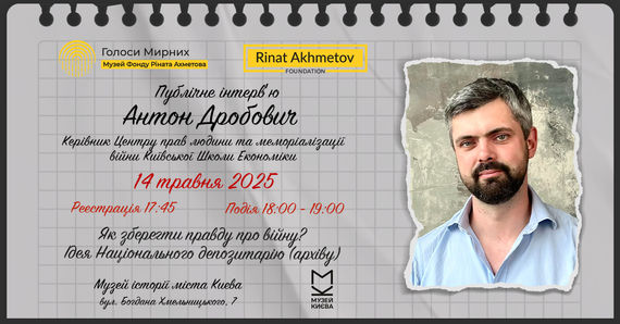 Музей «Голоси Мирних» Фонду Ріната Ахметова ініціює запуск платформи для обговорення майбутнього документації та архівування даних про війну. Цикл публічних інтерв'ю відкриє Антон Дробович — науковець, громадський діяч і керівник Центру прав людини та меморіалізації війни Київської Школи Економіки.