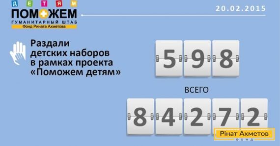 За 20 лютого, у межах проекту «ДОПОМОЖЕМО дітям», волонтери ФК «Шахтар» роздали 598 дитячих наборів для дітей віком від 0 до 2-х років, що проживають у Донбасі. Всього за час проекту Гуманітарний штаб Ріната Ахметова роздав 84 272 дитячі набори.