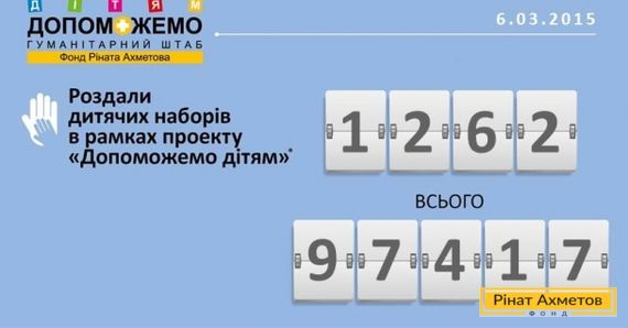 За 5 березня, у межах проекту «ДОПОМОЖЕМО дітям», волонтери ФК «Шахтар» роздали 1262 дитячі набори для дітей віком від 0 до 2-х років, що проживають у Донбасі. Всього за час проекту Гуманітарний штаб Ріната Ахметова роздав 97 417 дитячих наборів. За весь час роботи Гуманітарного штабу, починаючи із серпня 2014 року, було видано понад 135 000 дитячих наборів.