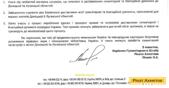 Звернення Гуманітарного штабу Ріната Ахметова до Президента України