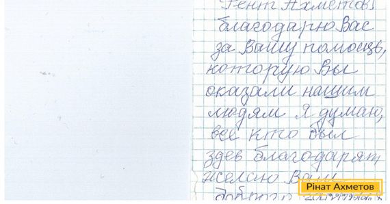 Крихітну й дуже зворушливу записку зі вдячністю на адресу Ріната Ахметова та Гуманітарного штабу на одному з пунктів видавання допомоги в Донецьку залишила пенсіонерка. Багато місяців вона отримує набори виживання, які є для неї важливою підтримкою й допомогою.