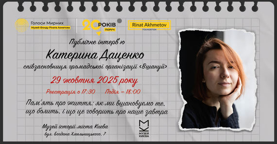 «Пам’ять про життя: як ми вшановуємо те, що болить, і що це говорить про наше завтра»: публічне інтерв’ю з Катериною Даценко, співзасновницею громадської організації «Вшануй» відбудеться у Музеї «Голоси Мирних» Фонду Ріната Ахметова