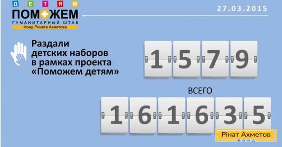 За 27 марта, в рамках проекта «ПОМОЖЕМ детям» Гуманитарный штаб Рината Ахметова выдал 1 579 детских наборов для детей от 0 до 2-х лет, проживающих в Донбассе. Всего за время работы Гуманитарный штаб Рината Ахметова раздал 161 635 детских наборов.