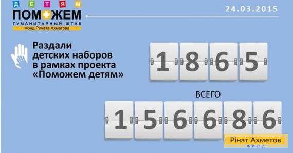 За 24 марта, в рамках проекта «ПОМОЖЕМ детям» Гуманитарный штаб Рината Ахметова выдал 1 865 детских наборов для детей от 0 до 2-х лет, проживающих в Донбассе. Всего за время работы Гуманитарный штаб Рината Ахметова раздал 156 686 детских наборов.
