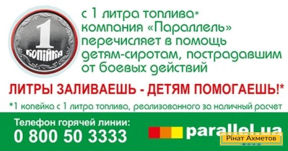 Компания «Параллель» подвела итоги благотворительного проекта «1 копейка с литра бензина в помощь детям». Акция проходила на протяжении месяца на всех АЗС сети «Параллель». В ней приняли участие розничные клиенты компании, откликнувшиеся на инициативу по сбору средств для помощи детям, полностью или частично осиротевшим в результате боевых действий на Донбассе.