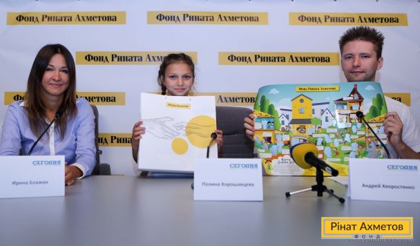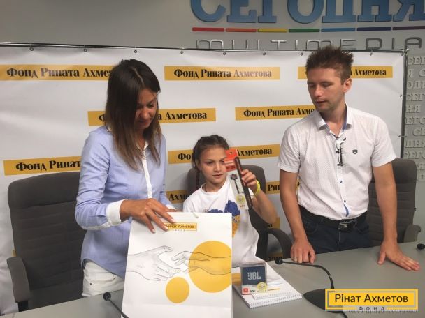 Полина стала одной из победительниц конкурса «Карта добрых дел». Прямо во время брифинга за свою доброту девочка получила призы от Фонда Рината Ахметова.