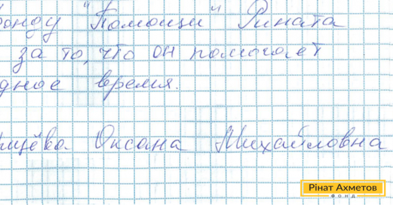 В адрес Гуманитарного штаба Рината Ахметова пришло письмо от жительницы Донецка. Оксана Михайловна благодарит Штаб за помощь в трудное время.