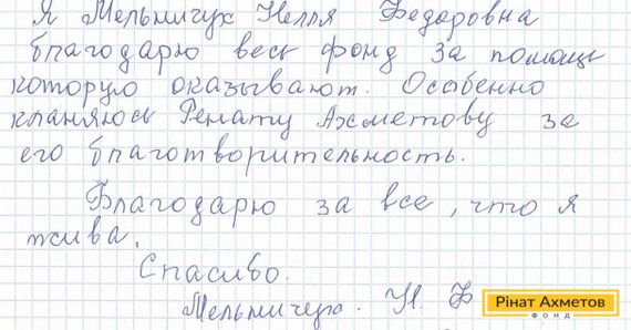 В адрес Рината Ахметова и сотрудников Гуманитарного штаба пришло письмо от жительницы Буденновского района Донецка. «Благодарю весь фонд за помощь, которую оказывают. Особенно кланяюсь Ринату Ахметову за его благотворительность. Благодарю за все. Что я жива», - пишет Нелля Федоровна.