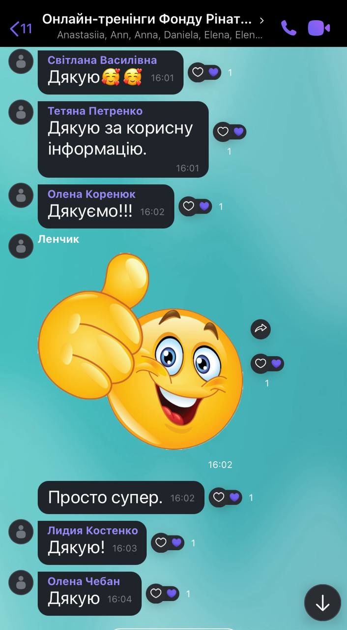 Після проходження тренінгу учасники отримали електронний сертифікат слухача. А ще залишили багато схвальних коментарів та слів подяки на Вайбер-сторінці чату тренінгів програми «Рінат Ахметов – Дітям. Сирітству – ні!».