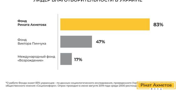Фонд Рината Ахметова – самая большая частная благотворительная инициатива в Украине. Масштабность программ позволила стать лидером узнаваемости по всей стране, почти вдвое опережая по показателям известности Фонд Виктора Пинчука. В тройку также вошел фонд «Возрождение» с 17% знания. Опрос проходил в июне-августе 2019 года среди 2000 респондентов и 10 фокус-групп.