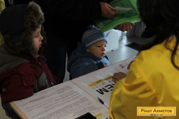 Волонтеры проекта «Поможем детям» раздают «детские наборы» семьям на «Донбасс Арене». 11.11.2014