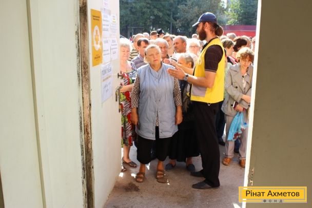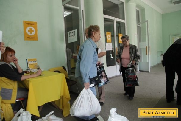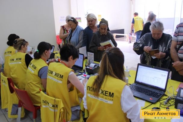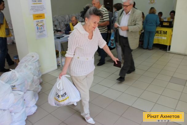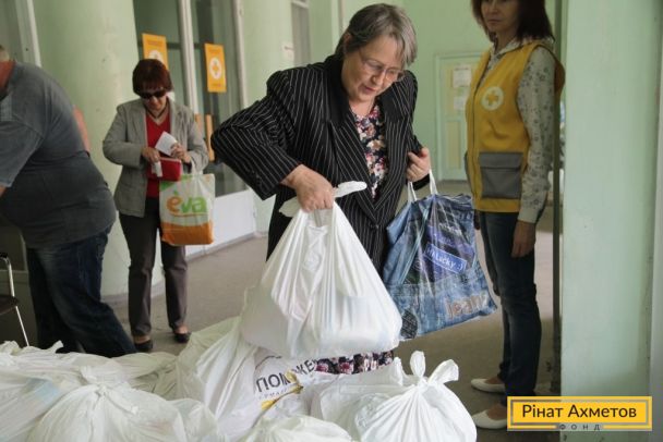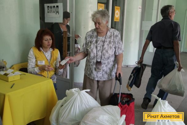 ФОТООТЧЕТ. Жители двух районов Донецка получают гуманитарную помощь от Штаба Ахметова