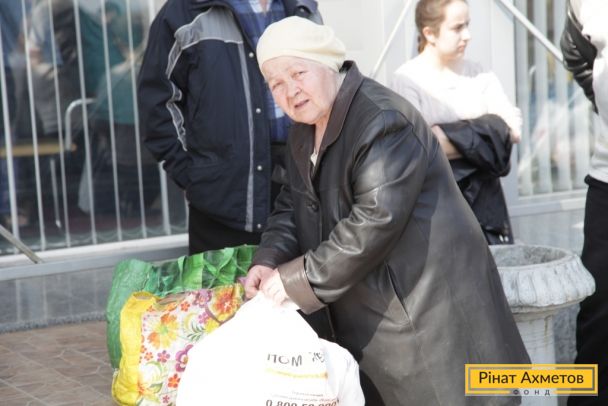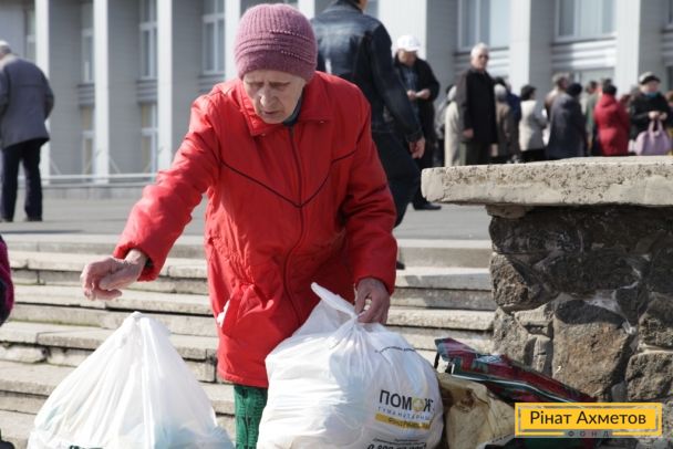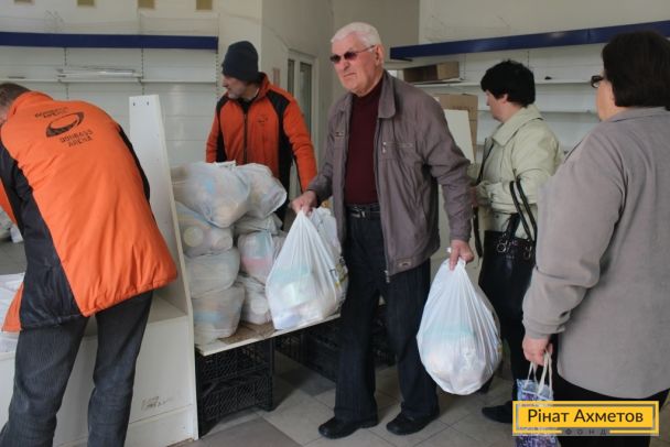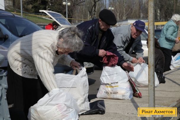 Мирные жители трех районов Донецка получают наборы выживания от Штаба Рината Ахметова, 13 апреля