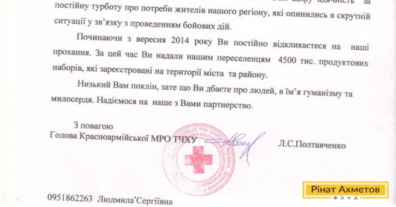 "Начиная с сентября 2014 года Вы постоянно откликаетесь на наши просьбы. За это время вы передали нашим переселенцам, которые зарегистрированы на территории города и района 4500 продуктовых наборов", - Глава Красноармейской городской организации общества Красного креста, Л.С. Полтавченко.