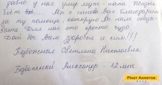 В адрес Рината Ахметова пришло искренне письмо с благодарностью от семьи переселенцев, которая проживает в Счастье. Мама-вдова и 12-летний сын Александр получают продуктовые наборы от Гуманитарного штаба.