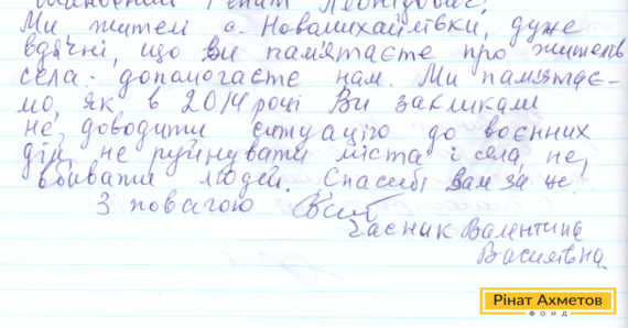 В адрес Гуманитарного штаба и Рината Ахметова продолжают поступать письма от мирных жителей Донбасса с благодарностью за гуманитарную помощь, которую Штаб выдает в «серой зоне».