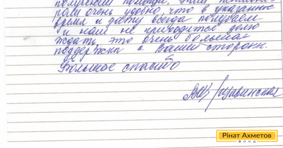 В адрес Гуманитарного штаба Рината Ахметова пришло письмо от жительницы Макеевки. Она пишет: «Прошу выразить искреннюю благодарность волонтерам Центрально-Городского пункта Штаба Рината Ахметова за высокую организационную работу, культурное обслуживание при получении помощи. Нам, пенсионерам, очень удобно, что в указанное время и дату всегда получаем помощь и нам не приходится долго ждать».