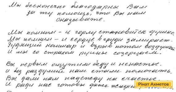 «Уважаемый Ринат Ахметов. Мы бесконечно благодарны вам за ту помощь, что вы нам оказываете», - говорится в письме. - Вы первым ощутили беду и несчастье, и без раздумий нам стали помогать. Вы дали нам надежду на счастье, и ради нас готовы жизнью рисковать».