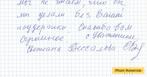 В адрес Гуманитарного штаба Рината Ахметова пришло письмо от жительницы Буденновского района Донецка. Светлана пишет: «Спасибо вам за помощь, которую вы нам оказываете, мы не знаем, что бы делали без вашей поддержки».