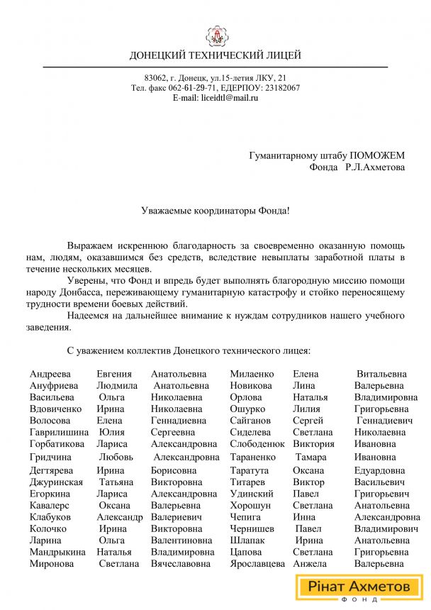 Сотрудники Донецкого технического лицея выражают благодарность Гуманитарному штабу Рината Ахметова за оказанную благотворительную помощь. Сотрудники лицея уже начали получать продуктовые наборы от Штаба в Донецке.