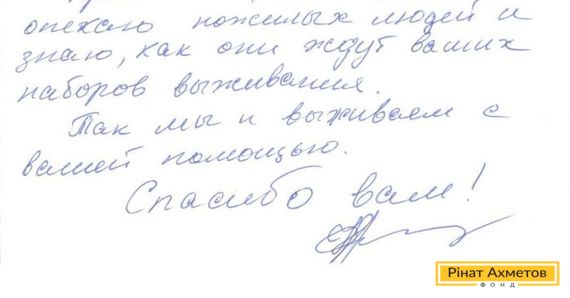 В адрес Рината Ахметова и Гуманитарного штаба пришло письмо от переселенки из Луганска. «Я воспитываю одна троих детей, мы лишились дома в Луганске и самого Луганска. Сомневаюсь, что мы могли бы выжить, если бы не помощь Рината Ахметова. Она стала для нас реальной и существенной поддержкой. Кроме того, я соцработник, опекаю пожилых людей и знаю, как они ждут ваш наборы выживания. Так мы и выживаем с вашей помощью», - пишет женщина.