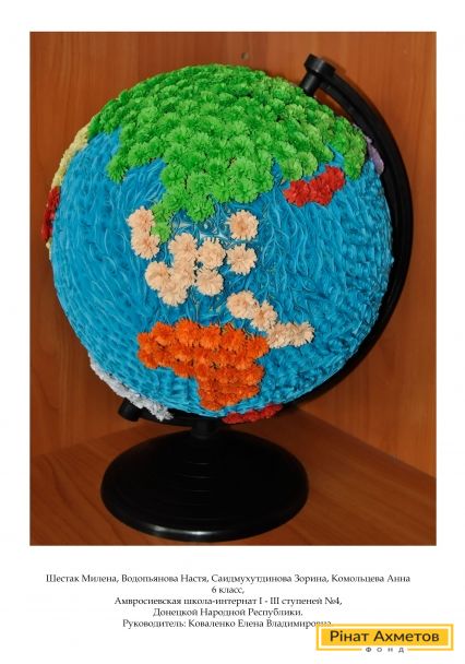 Приз за коллективное творчество – работа «Глобус» Шестак Милены, Водопьяновой Насти, Саидмухутдиновой Зорины, Комольцевой Анны. 6 класс Амвросиевской школыинтерната №4. Ребята получают игру «Клазл».
