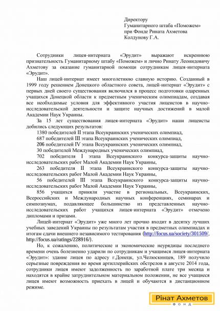 В адрес Рината Ахметова и сотрудников Гуманитарного штаба пришло благодарственное письмо от педагогического коллектива лицея-интерната «Эрудит» (Донецк) за полученные наборы выживания от Штаба. Коллектив много месяцев продолжает выполнять свои обязанности, не получая заработную плату. Для многих из них полученная помощь – единственный источник выживания.
